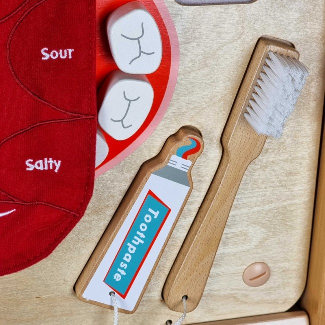 Ce jeu mural en bois, qui sera du plus bel effet dans votre salle d'attente de dentiste ou d'orthodontiste, traite du thème de l'hygiène bucco-dentaire.